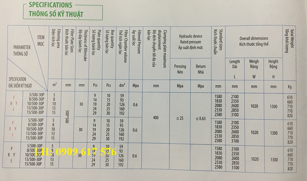 Bảng thông số kỹ thuật chi tiết của dòng máy ép bùn khung bản 500x500mm từ 10-30 bản lọc